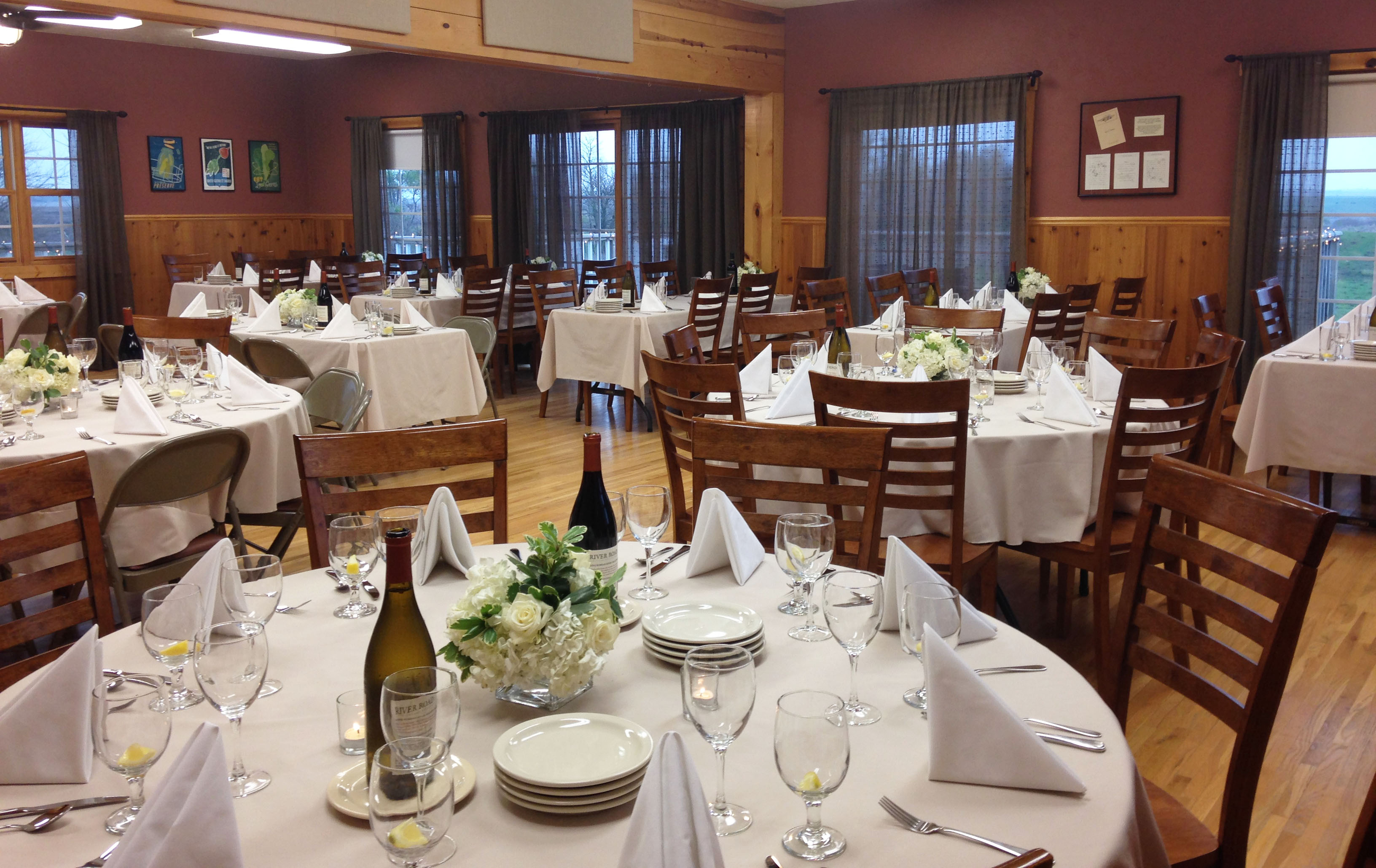 Indoor and outdoor spaces can be combined to fit nearly any sized gathering. The barn’s Gathering Room accommodates groups of up to 65 seated at round and rectangle tables or up to 90 theatre-style. The upstairs meeting room seats 30 to 35. Access to the second floor is by stairs or a small lift.